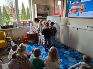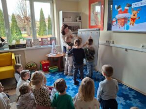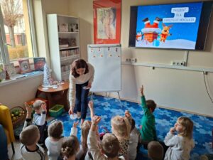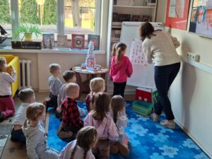 We wtorek, 17 grudnia 2025 roku w Bibliotece Pedagogicznej w Radomiu  Filia w Zwoleniu odbyły się świąteczne zajęcia edukacyjne dla dzieci z grup „Jeżyki” i „Sówki” z oddziałów przedszkolnych Publicznej Szkoły Podstawowej im. Władysława Jagiełły w Zwoleniu. Celem spotkania zorganizowanego przez nauczycieli bibliotekarzy było wprowadzenie dzieci w nastrój Bożego Narodzenia poprzez aktywności rozwijające wyobraźnię, umiejętności logiczne oraz sprawność ruchową.