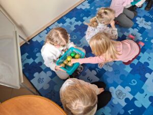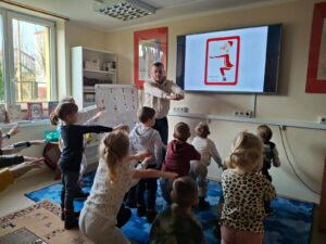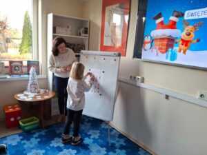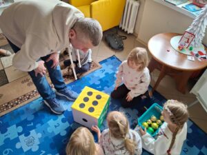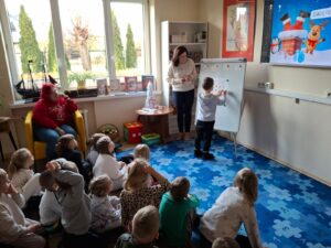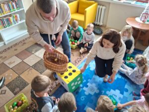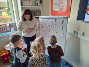 Po lekturze przyszedł czas na zadania, które wymagały od przedszkolaków skupienia i logicznego myślenia. Było mikołajkowe sudoku, które rozwijało logiczne myślenie oraz umiejętność koncentracji. Kolejnym wyzwaniem było „Kodowanie z reniferami”. Zadanie polegało na segregowaniu i układaniu reniferów według ich wielkości. To ćwiczenie wprowadziło najmłodszych w świat podstaw programowania i kategoryzacji. Dużo emocji wzbudziła zabawa „Matematyczne potyczki”  z kostką do gry. Losowanie liczby oczek wskazywało, ile bombek należy bezpiecznie przenieść do koszyka. Zadanie to doskonale łączyło naukę liczenia z treningiem koordynacji ruchowej.
