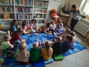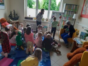 W drugiej części spotkania przedszkolaki wykonały aktywne ćwiczenia związane z treścią utworu m.in., zliczały kacze jajka w gniazdach, wyszukiwały kaczuszki po kolorach i liczyły kurczaczki. Spotkanie „z ptakami” zakończyliśmy zwiedzaniem wystawy z ptakami w roli głównej, która została wypożyczona z Galerii i Ośrodka Plastycznej Twórczości Dziecka w Toruniu.