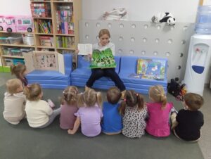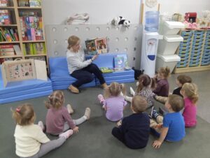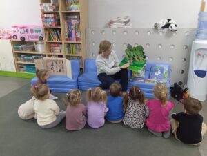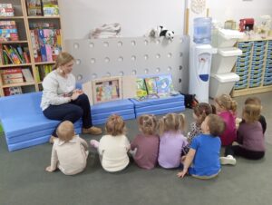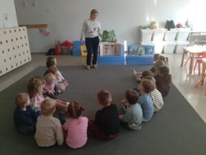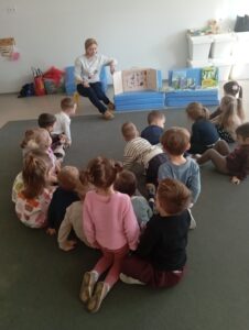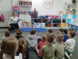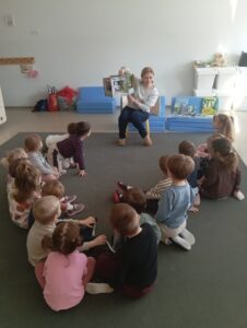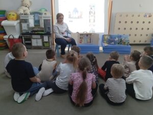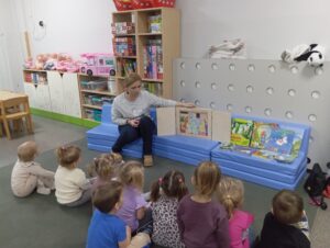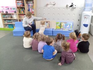Dzieci z grupy przedszkolnej „Biedronki” podczas zajęć edukacyjnych w ramach ogólnopolskiej akcji czytelniczej „Czytamy Muminki”.