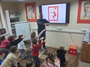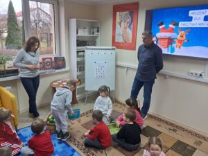 Nie zabrakło również aktywności fizycznej. „Myszki” wzięły udział w mikołajkowej gimnastyce. Zabawa pokazała dzieciom, że ruch to ważny i radosny element każdego dnia.