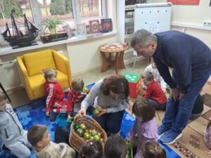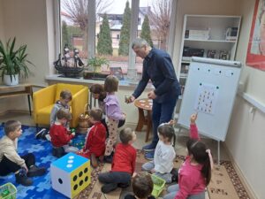 - Matematyczna zabawa z kostką: Dużo emocji wzbudził konkurs przenoszenia bombek do koszyka – o liczbie ozdób decydował rzut kostką, co było świetną okazją do doskonalenia umiejętności liczenia.