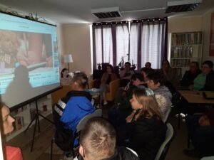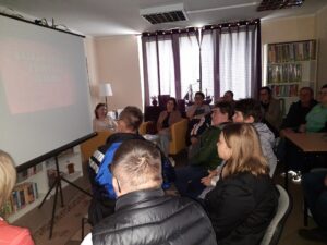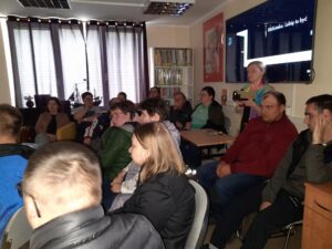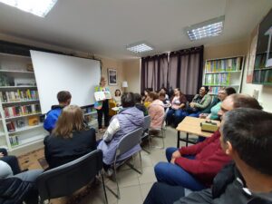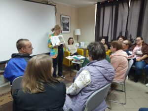 Spotkanie było fascynującą podróżą przez dzieje książki – od starożytnych form zapisu, takich jak papirus, aż po współczesne publikacje. Uczestnicy mieli okazję zobaczyć, jak dawniej wyświetlano obrazy za pomocą rzutnika, a jak wygląda to obecnie przy użyciu projektora multimedialnego. Z dużym zainteresowaniem poznawali, jak na przestrzeni wieków zmieniały się forma i funkcja książki, a następnie wykazali się kreatywnością, projektując unikalne okładki do własnych miniaturowych książek.