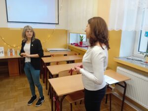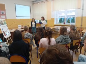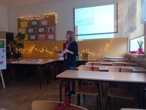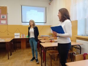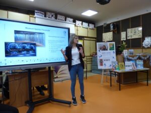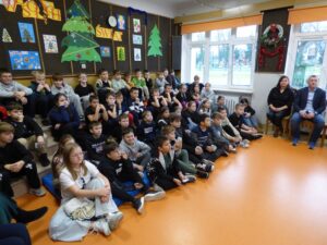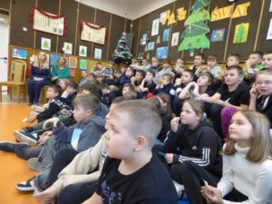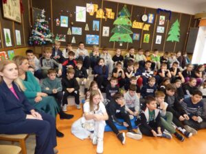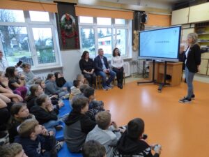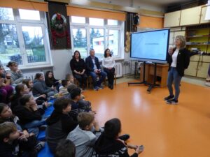 Pani Marta w pasjonujący sposób przybliżyła młodym słuchaczom świat sportu, opowiadając o swojej pracy, przygotowaniach wystaw i relacji, spotkaniach ze znanymi zawodnikami i trenerami. Szczególną uwagę poświęciła tematyce igrzysk olimpijskich – sztafetom, pochodniom olimpijskim, wyjaśniając ich symboliczne znaczenie oraz historię tradycji. Niezwykle cenne były ciekawostki z życia najwybitniejszych zawodników okresu międzywojennego – mistrzów olimpijskich i patriotów – Haliny Konopackiej i Janusza Kusocińskiego.